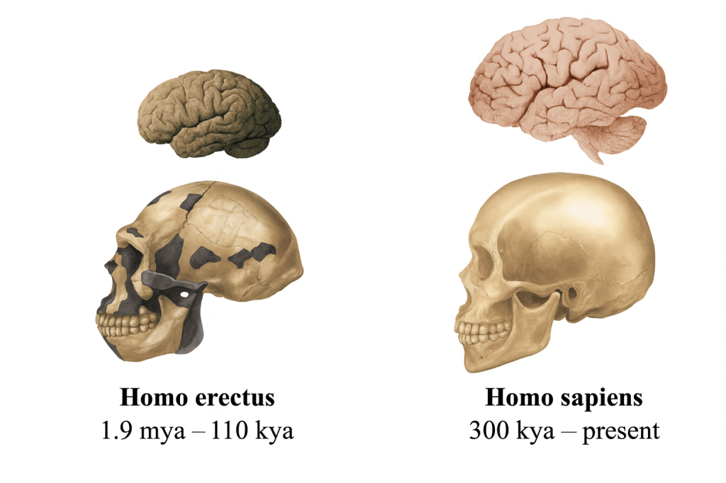 Some, like Richard Wrangham, believe that cooking began earlier. He argues that cooking began between 1.9 and 1.6 million years ago, allowing ancestors to gain more energy from food, grow bigger brains, and develop smaller teeth and jaws. Cooked food is softer and easier to digest, meaning less energy is spent eating and more can fuel the body and brain. The anatomical changes reflect cooking’s impact. Over time, teeth and jaws shrank, while brain size increased dramatically. Early Homo had brains similar in size to chimpanzees’, but after Homo erectus appeared about 1.9 million years ago, brain size tripled. Cooking also allowed smaller stomachs and intestines, freeing energy for a larger brain – the “expensive tissue hypothesis.”